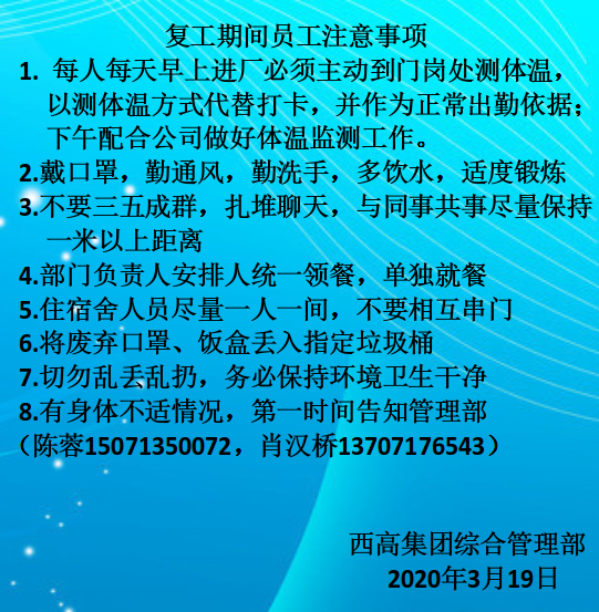 為深入貫徹落實(shí)總書(shū)記關(guān)于堅(jiān)決打贏疫情防控阻擊戰(zhàn)的重要指示精神,全面落實(shí)黨中央、國(guó)務(wù)院和省委、省政府、漢陽(yáng)區(qū)政府關(guān)于疫情防控工作的決策部署,切實(shí)做好疫情防控期間企業(yè)復(fù)工復(fù)產(chǎn)工作,在中共武漢西高電器有限公司支部委員會(huì)書(shū)記周雄同志的帶領(lǐng)下, 武漢西高電器有限公司主要從以下幾方面開(kāi)展防控工作: